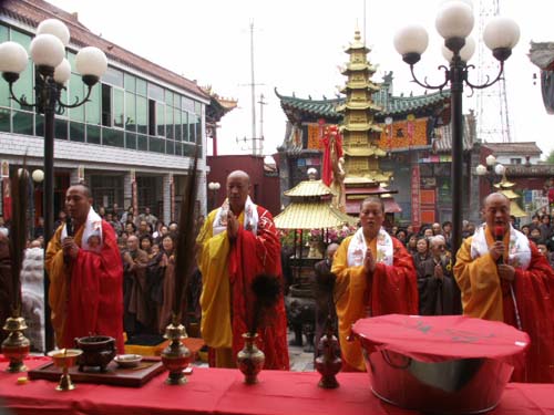 上午九点,法会在庄严的“三宝歌”歌声中拉开了帷幕,全体与会者起立合掌,随着音乐的旋律吟唱着。在主席台就坐的教界人士有深圳弘法寺延菩法师、西宁市佛教协会会长慈云法师、杭州灵隐寺慈眼法师、苏州寒山寺佛学院智慧法师、河南少林寺圣吉法师,以及青海省市各级领导等方方面面的领导、嘉宾。