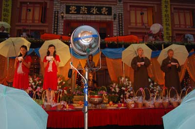 据了解,音乐会的开办过程中,天将吉祥雨,但所有参加的心中都没有离去,坚持到了最后。寺院的怀阳向记者介绍,参加此次音乐会的全部节目,均为三临学院梵音乐团的人员自编自演。《金刚罗汉一声吼》、《倡导八荣八耻》、《吉祥颂》等曲目全部由中严法师制作。明日,将举办“赞叹观音菩萨工的盛会”。