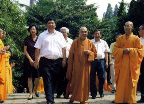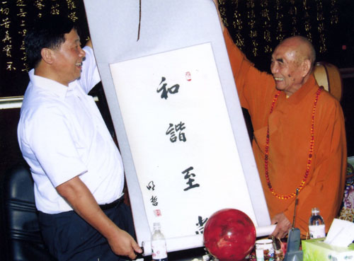2007年7月21日下午,国家宗教局叶小文局长一行数人,在青岛市统战部张惠部长及青岛市宗教事务局崔延南局长的陪同下,参观了青岛湛山寺。叶局长的来访受到了湛山寺住持、山东湛山佛学院院长明哲长老及僧众的热情欢迎。明哲长老先后带领客人参观了湛山寺的大雄宝殿、三圣殿、卧佛殿、法堂、钟楼。参观结束后,叶小文局长与明哲长老举行了亲切交谈,明哲长老将亲笔书写的“和谐至尚”四字一幅敬送,叶局长非常高兴,希望湛山佛学院越办越好,为国家培养出优秀的佛教人才。