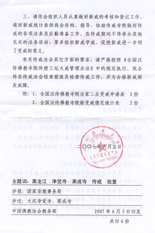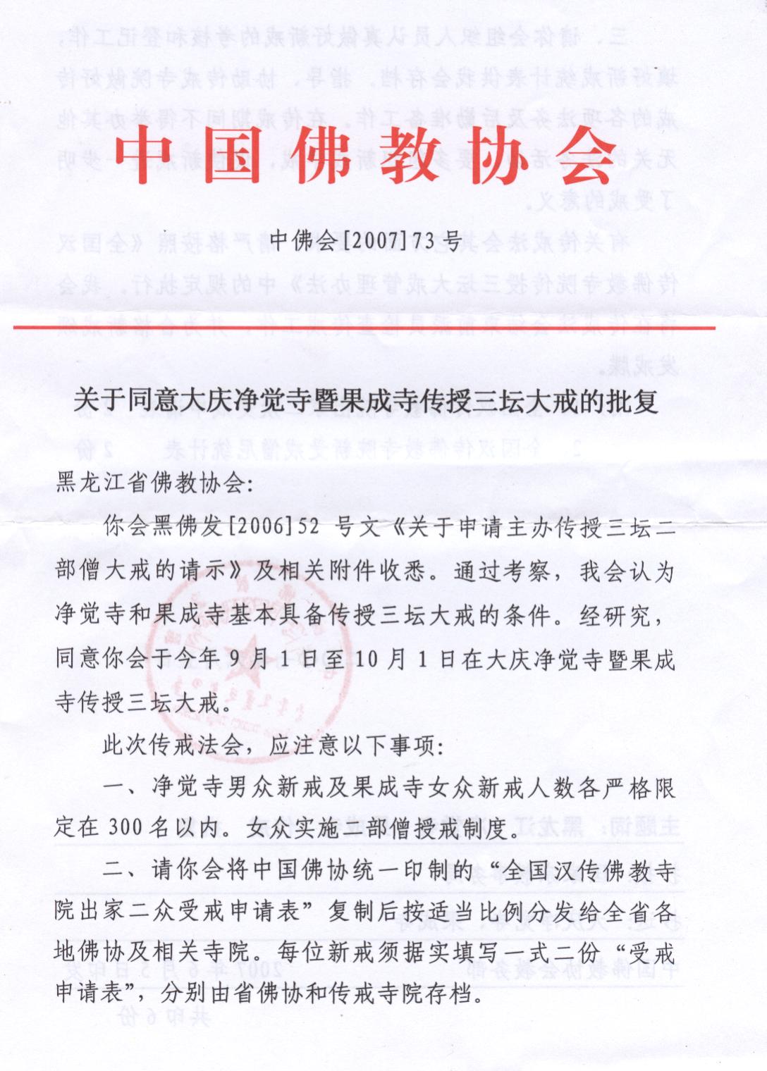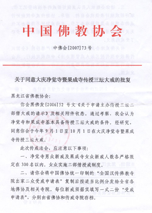 黑龙江省大庆市佛教协会传戒办公室 2007年6月12日