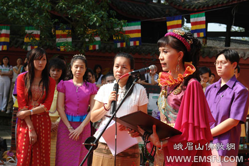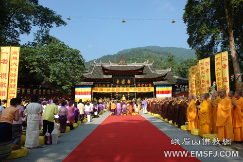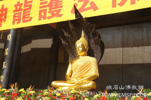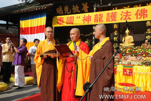 7月29日(农历6月16日),峨眉山佛教协会在报国寺隆重举行泰国“神龙护法佛”像迎请法会。峨眉山佛教协会会长、报国寺方丈永寿法师及峨眉山100多名僧众和专程护送“神龙护法佛”像到峨眉山的泰国昭南沙拉侬(旺吉)克康瑟威(丽善)郡主及随行200余人,以及各地信众共4000多人参加了佛像迎请法会。
