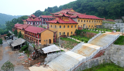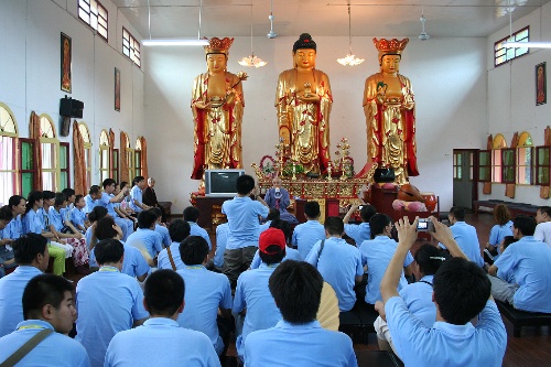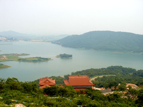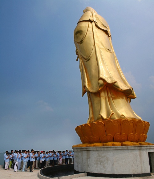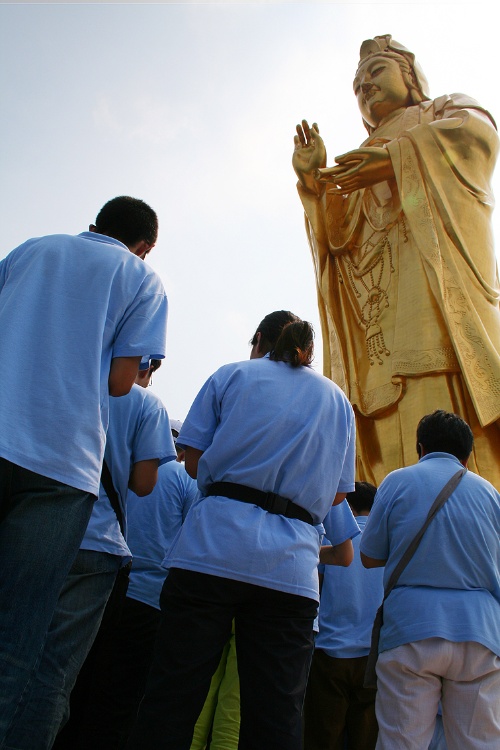 下午两点,营员们乘车参访巢湖市邻近的两座寺院"和县观音寺"和"褒禅寺".和县观音寺地理位置极佳,周围群山环抱,碧波万顷,一尊38米高的观音菩萨像屹立在湖滨之上,俯视着芸芸众生.智文法师身肩观音寺道场的修建工作,建设历时两年,主体工程以基本完工,内部装修和周边遍配工程未完工.大家在在观音像共同念诵<心经>回向,祈愿观音寺道场早日圆满建成!