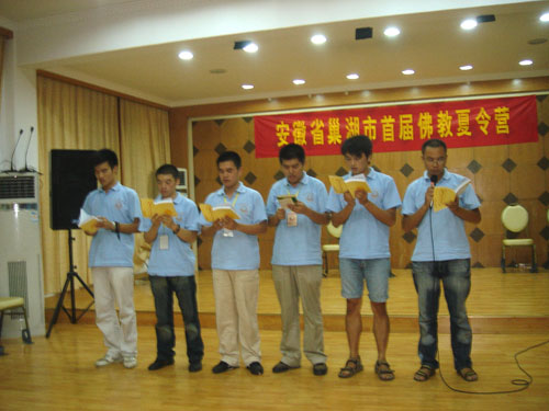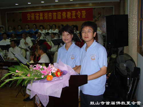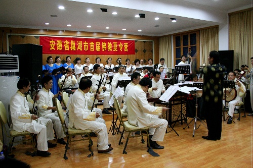 晚七点,在鼓山寺讲堂举行了"鼓山之声--首届佛教艺术夏令营联欢晚会".巢湖市民宗局局长陈来安、区民宗局冉民化局长、张有新局长等领导莅临联欢会.参加晚会的还有《甘露》杂志主编黄复彩老师、中国职业经理人学会副会长高培峰居士.本次晚会得到了合肥市专业艺术团体的支持和参与义演,国家一级指挥周小平先生,安徽省二胡大赛成人组一、二、三等奖或者者胡荣杰、郭平、张熊飞和在国内外多次获奖的徐仁健老师.