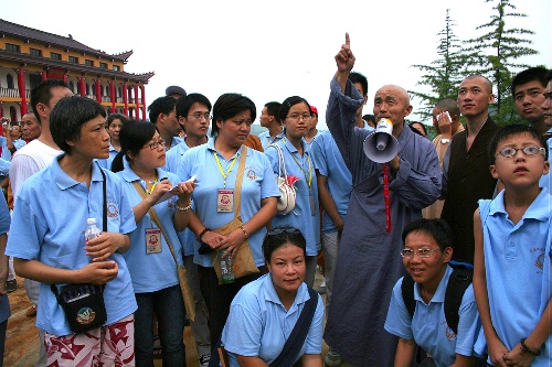 离开观音寺,下一站来到褒禅山,使人不由自主地想到王安石的《游褒禅山记》,此寺名正因此文得名。该寺方丈是德高望众的绍云老和尚,曾在夏令营为大家作过禅学开示.因为修路关系,来寺时间已延迟多时,但绍云老和尚非常慈悲,依然在山门亲自迎接营员们的到来.绍云老和尚为大家讲解琉璃宝塔的开光,当时挖地基时神奇地从地下挖出形似乌龟的巨石,现在还安放在塔前,大家不禁啧啧称奇。营员们登上了琉璃宝塔,参观了规模宏大的念佛堂,绍云老和尚为大家作佛学开示.晚五点,营员们结束了参访活动,乘车返回鼓山寺.