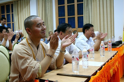 本届夏令营以佛教艺术为主题,自然吸引了很多专业艺术院校的学子前来参加,他们在晚会中的表现更加不俗,领导和老师们都给予了高度的评价.来自上海戏剧学院的秦峰擅长扮演老生,但今天他为大家演唱的是《敢问路在何方》,这首歌是智文法师最喜欢的一首歌,饱含了修行者坚定的信念.来自合肥的单周学习过专业美声,一首《儿行千里》声情并茂,把大家都听呆了,夏令营真可谓是藏龙卧虎,人才济济.