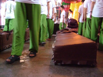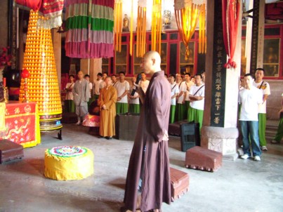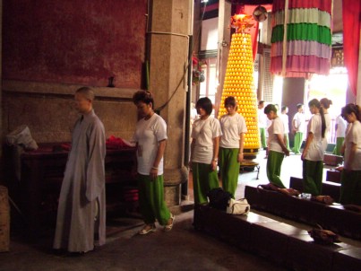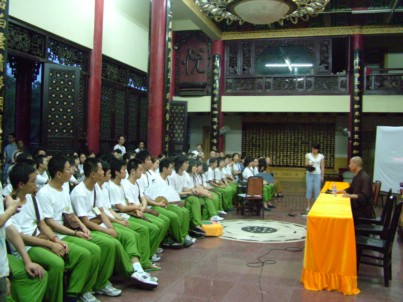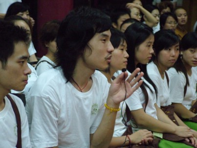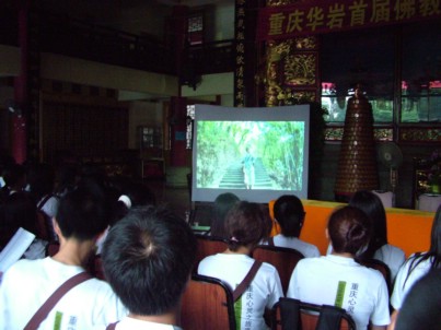 中国佛网消息 华岩寺报道:2007年8月20日,“重庆心灵之旅夏令营”进行到第三天。禅修,是佛教夏令营要内容。双桂堂大雄宝殿内,在奘师的指点和定虎法师的亲自带领下,营员们学习行禅与坐禅。晚上7点,在华岩寺弘法楼大厅请营员们欣赏了“奘师佛国禅游之旅”光碟后,奘师给大家讲述了他在印度斯里兰卡之行的众多趣闻逸事,并回答了众多营员的积极提问。