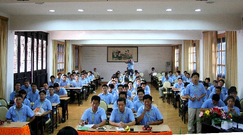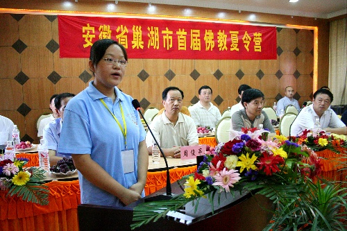 8月1日清晨,清风徐徐,百鸟鸣唱,鼓山寺内一派祥和之气,营员们静静的期待着夏令营的开营仪式.上午8:00,鼓山寺首届佛教艺术夏令营隆重开营.巢湖市区统战部副部长许克保,巢湖市民宗局陈来安局长、冉民化局长莅临会场,并发表重要讲话,并预祝首届夏令营圆满成功!开营仪式由巢湖市佛协秘书长张佑保主持,鼓山寺住持智文法师依次发表了热情洋溢的欢迎辞.感谢各级领导对首届夏令营活动给予的支持,欢迎来自全国各地的营员们前来参加夏令营.