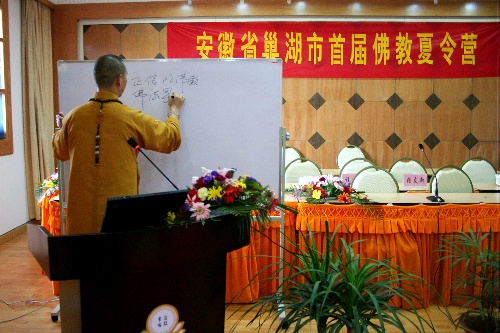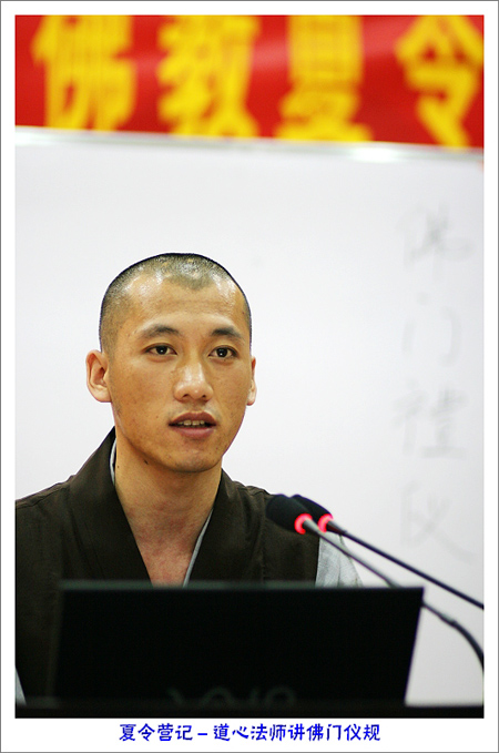 晚6:30,道心师父为夏令营讲解佛门礼仪。法师从如何尊敬佛像,如何礼佛,如何尊敬僧人,斋堂礼仪等几个方面,做了生动形象的讲解,其诙谐幽默、惟妙惟肖的讲课风格,让营员有身临其境之感,赢得了阵阵掌声与笑声,大家在欢笑之余学到了规矩,懂得了威仪。