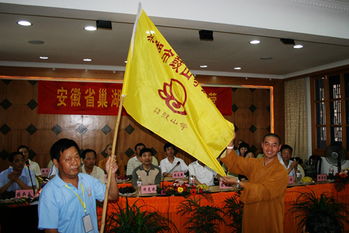 开营仪式上正副营长代表全体营员表态发言,对鼓山寺为夏令营做的各项筹备工作,在人力、财力、物力上做出的努力和无私奉献表示衷心的感谢.夏令营将是人生中最珍贵的七天,大家一定遵守寺规,积极参与,认真体悟佛法,将佛法融入到每个人的生活中.在热烈的掌声中,智文法师将首届鼓山寺佛教艺术夏令营营旗授予营长刘世杰。
