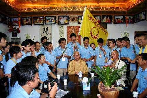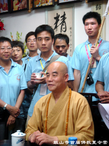 九华山百岁宫慧庆大和尚在会客室接待了夏令营一行