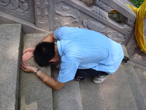 下午三点,朝拜九华山活动圆满结束,夏令营一行踏上回往巢湖鼓山寺的旅行车,车辆在峰回路转的山道上行驶,大家的心情久久不能平静.虔诚的佛弟子啊!佛陀已经接受了你们的祈愿和祝福,大愿地藏王菩萨在向你们微笑呢!