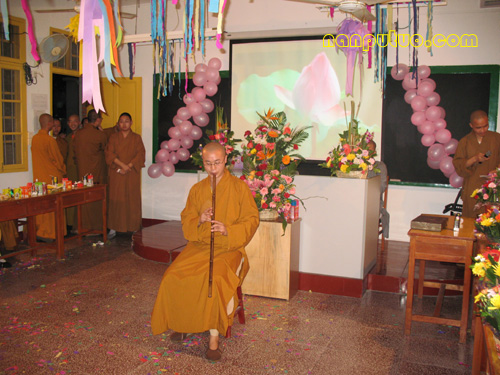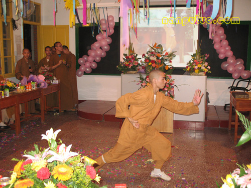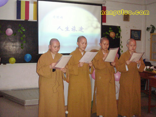 晚会上,教导长达源法师、副教导长超波法师以及各位法师给同学们带来了节日的祝福和真切的问候,学僧们满怀深情的诗歌朗诵,优美婉转的笛箫之声,异域风情的舞蹈,热情洋溢的歌声,幽默滑稽的魔术以及刚柔并济的武术表演,赢得了热烈的掌声,大家沉浸在节日的气氛中。最后,师生同唱一首歌,晚会在欢乐的海洋中落下帷幕。