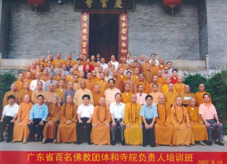 9月14日至22日,广东省佛教协会在肇庆庆云寺举办全省百名佛教团体和寺院负责人培训班,广东省106名各级佛协和较大寺院负责人参加了培训。培训期间,大家分别学习了国内国际形势、政策法规、佛教戒律、寺院管理与七项管理制度相关的知识、公文写作等课程。开学典礼上,广东省民族宗教委杨源兴副主任、广东省佛教协会明生法师、肇庆市统战部谢锦文部长分别作了讲话。杨源兴副主任希望大家充分认识加强佛教自身建设的重要性和紧迫性;从思想建设、组织建设、制度建设、道风建设、人才建设方面努力将加强佛教自身建设落到实处。明生法师强调,培养人才是促进全省佛教工作全面发展的重要任务;健全制度,加强管理是促进全省佛教事业有序健康发展的中心工作;围绕中心、服务大局是落实全省佛教服务构建和谐社会的基本要求。并希望全省佛教团体和寺院负责人以身作则,加强学习,不断提高素质,在培养人才、加强管理、服务社会方面更好地发挥模范带头作用。