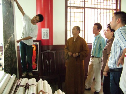 道坚法师即将于本月8、9、10三天在中国三峡博物馆举行“道坚法师个人收藏展”。图为裴处长一行仔细的观看道坚法师即将展出的个人收藏品