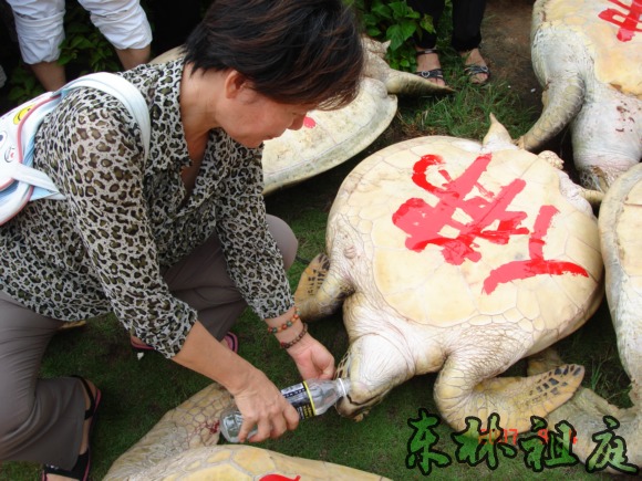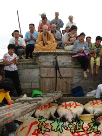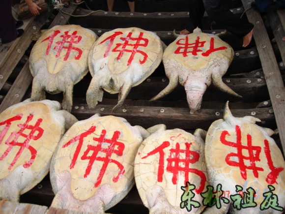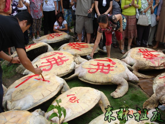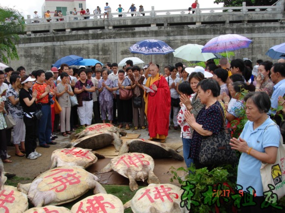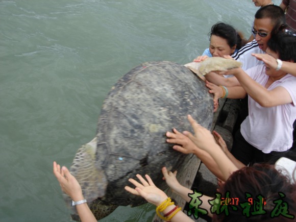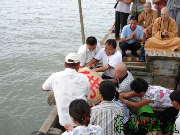 9月4日下午,弘法团一行在海口组织了一次大型海上放生法会,总共买了十八只巨龟,其中最重的海龟的近300斤,据当地人讲其寿命最少有200岁。大安法师主法,弘法团成员全部参加,海口各放生小组第一次共同合作,集体参与,此次放生法会参加人数之多,放生巨龟之数量,放生的规模和影响力创建了海口放生法会之最。为了保证所放的海龟能安全回归大海,我们一共租了六条船,向南海纵深行驶了近二小时,确定进入了安全地带后,大家才齐心协力,满心欢喜地把可爱的大海龟放回南海,别看大海龟在陆地上很笨拙,爬行速度超级慢,一旦他们进入海里,速度令人瞠目,转眼之间就游出几米开外,有两只大海龟很有灵性,游出20米之外后,又浮出水面,回头挥挥他们可爱的手,向我们感谢和告别,大家都非常开心,齐声鼓掌欢呼,并挥手向海龟致意,场面非常感人。