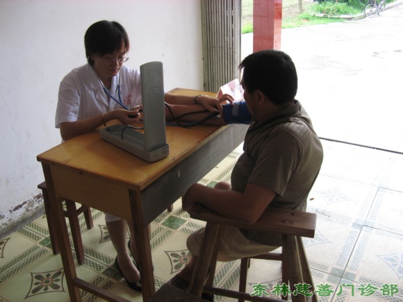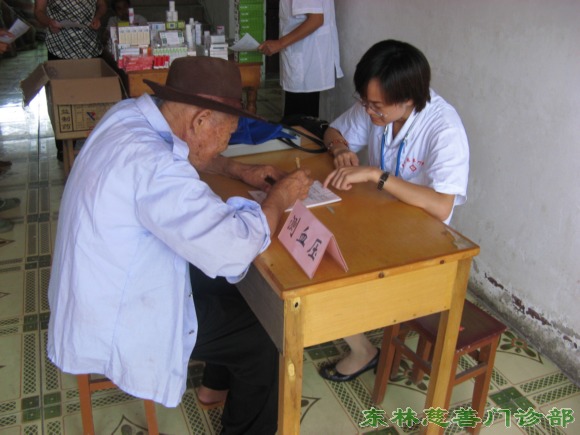 上午九时我们走进了福利院的大门,门口写着:“老有所乐,老有所为”等字,这家福利院是由政府、社会上的善心人士和出家师父捐款专为那些鳏寡孤独,老无所靠,身患残疾的人而建立的,这里曾经最多的时候住了68人,现在因某些原因只有38人长住,年龄最大的90岁,最小的40岁。他们都是要么身患残疾,要么聋哑,要么年老体衰的不健康的人,政府每个月每人给补贴生活费100元,每年补助医疗费100元。对于这些本身就不符合WTO(世界卫生组织)健康标准的人而言,这些补助只是杯水车薪。由于福利院目前居住的人并不多,上午我们只接诊了一些病人,他们大多都患有高血压。其中给我印象深刻的是一个柱着拐杖,下肢畸形,身高1、5米左右的病人,很艰难地移动着双脚,坐在我面前叫我帮他量血压,看着他艰辛的样子,我的内心无比的感慨:四肢健全,身心健康的我们是多么的幸运和来之不易!当满脸皱纹,皮肤松弛的86岁老太太走向我的时候,我想她不也曾经跟我们一样拥有如花的容颜,光洁的肌肤吗?而今岁月的变迁,除了给她们带来了容颜的改变,在她们的心里又刻下了多少沧桑的印记?她们的家庭,她们的儿女呢?为什么她们今天只落得孤苦伶仃的生活?