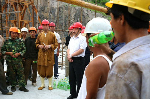日前,浙江省奉化市副市长何剑波一行在雪窦寺方丈怡藏法师的陪同,来到奉化市重点工程--雪窦山露天弥勒大佛建设工地, 慰问在三伏天继续奋战在一线的建筑工人,把清凉送到工人手中.