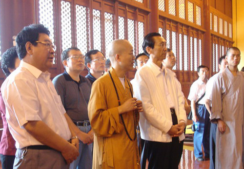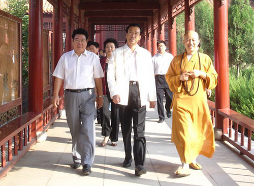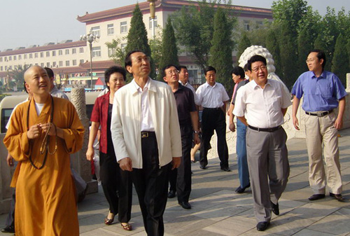 9月23日早晨,河北省委常委、省委统战部部长刘永瑞陪同内蒙古自治区党委常委、统战部部长付来旺一行来到柏林禅寺参观,受到明海法师、知客利生法师的热烈欢迎。