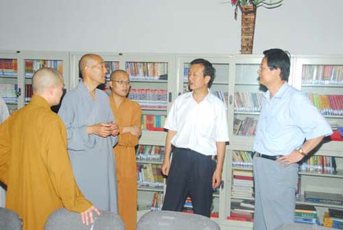 首先诸位法师陪同巴处长一行参观了佛学院的体育场,教学楼及学生宿舍。巴处长一行对现有的办学硬件设施比较满意。同时也给佛学院提出来一些宝贵建议,诸如学校消防、教室灯光、电教室和教务处办公设施等,近期还要尽快完善落实到位。