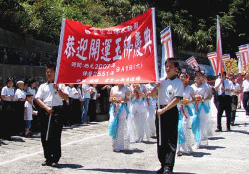 9月1日,中国台湾省灵鹫山四众弟子与心道法师一同喜迎来自缅甸的开运玉佛。开运玉佛在四众弟子的迎接下,暂时安放在华藏海东单,并在心道法师揭幕下正式与四众弟子结缘。