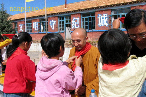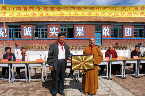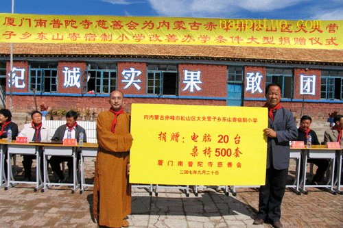 9月20日上午十一时许,“南普陀寺慈善会向东山小学捐助仪式”在东山小学举行,与会领导有赤峰市民委刘树田主任、王力民科长、房柏林科长;松山区政府董海瑞区长、区教育局王晓峰局长、区民委张文礼主任;大夫营子乡党委张玉峰书记;赤峰市佛协副会长、万佛寺住持佛月法师;赤峰市交通局职业学院刘凤琴书记;赤峰市双泰铜业开发总公司总经理刘书文先生。东山小学全体师生及赤峰市的各个新闻媒体也都参加了此次捐赠活动。正兴法师在仪式上,鼓励孩子们珍惜现在的学习机会,努力学习,将来成为祖国的栋梁。