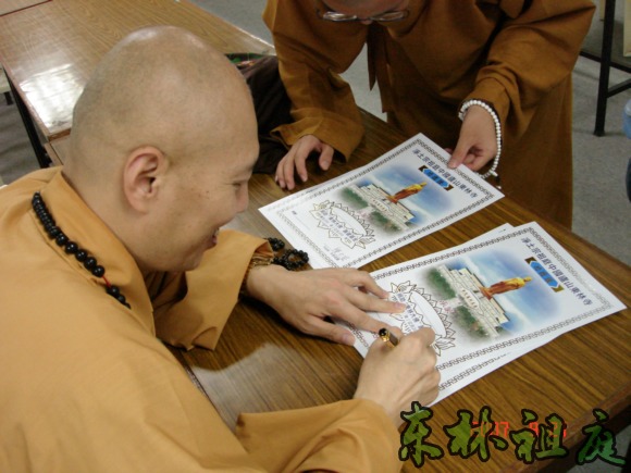 功德证供不应求,大安法师正在功德证上签字证明。