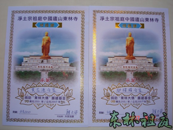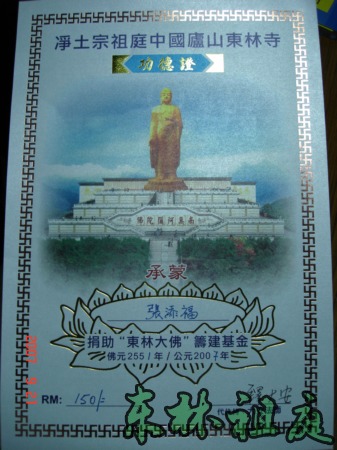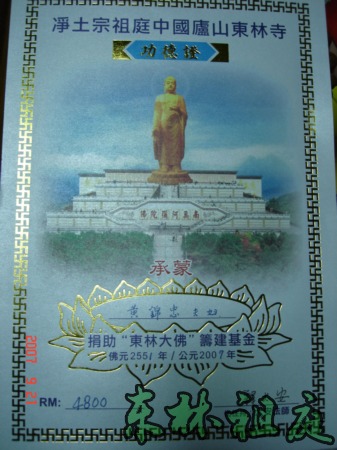 东林大佛捐款功德证。