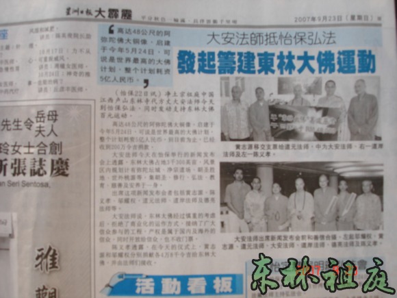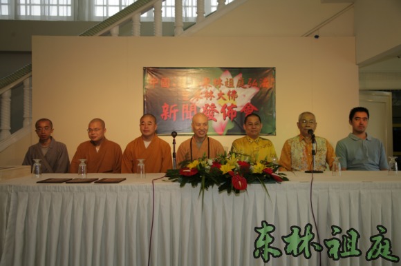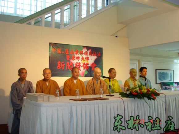 2007年9月22日,在马来西亚霹雳州怡保市舜苑大酒店,召开了东林祖庭弘法暨东林大佛新闻发布会。马来西亚社会各界知名人士及各大新闻媒体的记者都应邀出席。新闻发布会由马来西亚陈义孝老居士主持。在法师发言时,各大新闻媒体的记者都不停地作笔录。法师比较详尽的介绍了东林寺的修行弘法的现状以及东林大佛的缘起,理念,规划,现状及远景。法师特别强调了东林大佛建成后不收门票,让所有想拜佛的信众都能拜得起佛。法师发言结束后,举行了聘书授予仪式,分别委任黄志源居士,邬耀权居士,陈义孝居士为东林大佛在马来西亚的代表,负责代收筹建东林大佛捐款事宜。三位居士非常欢喜地接受了聘书,黄志源居士和邬耀权居士还分别带头现场捐款,每人捐款48000令吉(折合人民币约10万元),寓意阿弥陀佛48大愿。