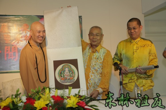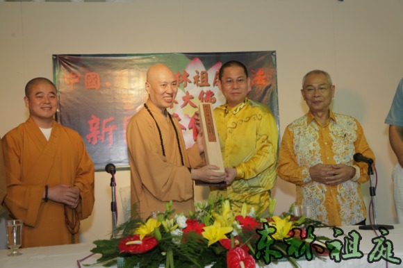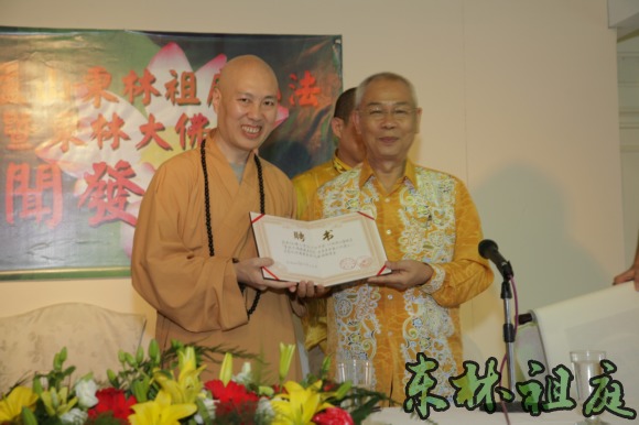 法师代表东林大佛筹委会赠送纪念品给黄志源居士。