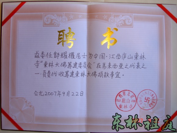 授予邬耀权居士的聘书。