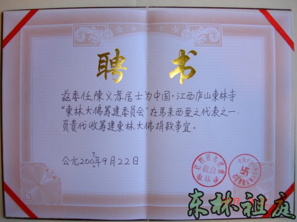 授予陈义孝居士的聘书。