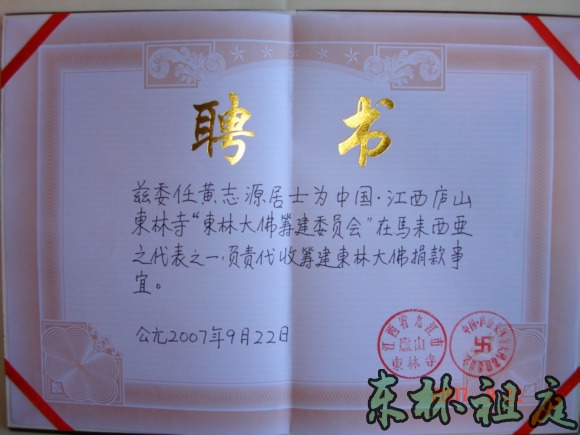 授予黄志源居士的聘书。