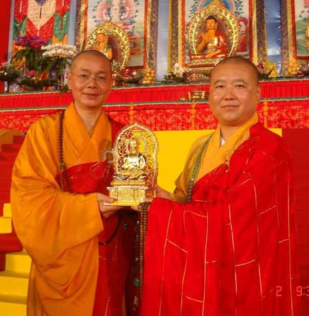 供佛斋僧大法会在台北林口体育馆盛大举行, 约四万余佛教四众弟子出席法会,其中有四千多位僧尼。大陆代表团与众多高僧大德共同主法、诵经,祈祷两岸人民安康、社会安宁、世界和平。团长觉醒法师在大会上致辞指出: 两岸佛教同根同源,两岸人民心手相连。在去年首届世界佛教论坛召开之际,两岸四地高僧大德汇聚浙江杭州、普陀山,与世界各国佛教徒一道,共同研讨佛教为维护世界和平、致力构建和谐世界的方略大计,世界因之而振奋、佛子为之而欢呼,两岸四地佛教徒在“和谐”问题上的共识与团结,让我们看到了中国佛教的希望和未来。今天,“中华国际供佛斋僧功德会”在宝岛台湾,透过供佛斋僧活动,向世界展示中华佛教“知恩报恩”的传统美德,相信在座的各位一定会从中深受教益和启发。祈愿今日供佛斋僧功德,回向于人天寰宇,激励广大佛教四众弟子,为中华佛教的发扬光大、为两岸早日实现和平统一做出积极的贡献。