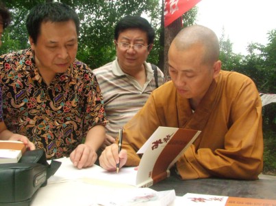 华岩寺方丈、无尽学社社长道坚法师在为会员签名留念