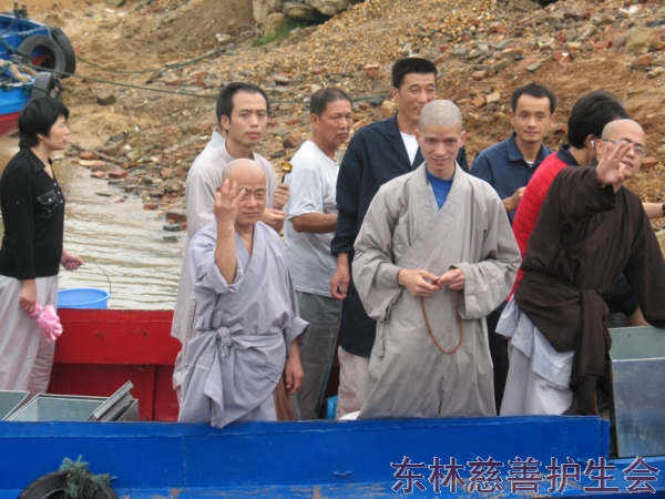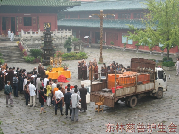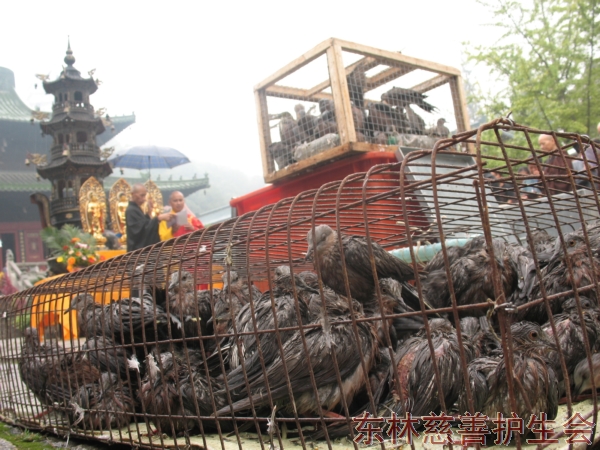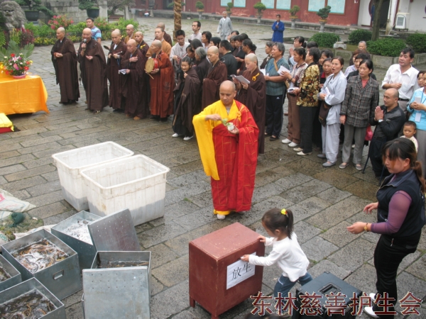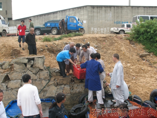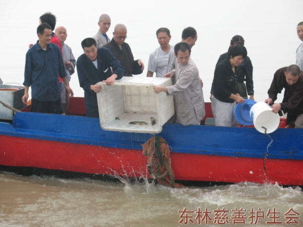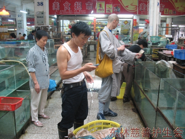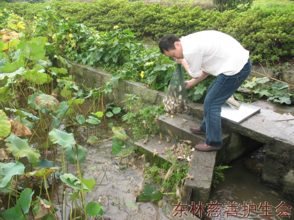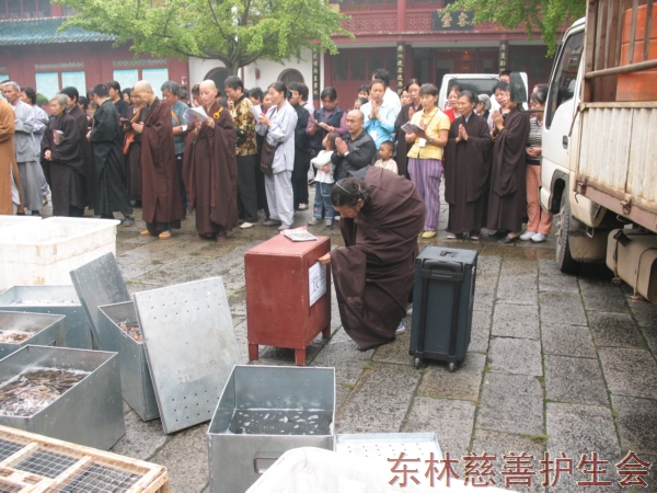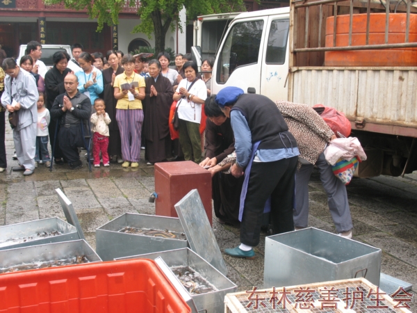 在买生放生之中,我们也将以前总结的经验应用到整个过程。与那些商贩之间谈价格的策略,哪类动物的生命能力比较强适合放生,运输过程中如何提高它们的存活率……等等。以前有很多人对我们的做法表示惊奇不解,甚至耻笑,慢慢的也变得接受和理解了。有些商贩知道我们把东西买去放生,在价格上都给予了很大的让步;也有不少商贩都会乐意拿出自己本来准备卖的东西交给我们去放生。在市场上我们也会不时碰到一些人过来说:“是放生吧?我也出点钱了!”就这样在购买现场还收到不少的随喜乐助款呢。更当我们碰到有人在商铺前挑买活物准备要宰杀的时候,我们会不遗余力的跟他们讲为什么要吃素,为什么要放生,跟他们讲佛说一切众生无始劫来互为六亲眷属的道理。这真是刀下留命千钧一发的危险场面,甚至有时情况危急之中我们都会有点无礼的说,这些我们全买了,不能卖给你了。也会碰到一些很顽固的人不听劝导。但也有不少人在听我们讲完之后就静静的离开,放弃了之前的购买计划。从表情上也都读得到他们已经有了某种认可和触动,这也是我们感觉到最为殊胜的地方。大家想想,如果全世界的人们会在某一个时间同时放弃那种以夺取他人生命而饱己腹的无情生活方式,我想那应该是我们这个世界最安宁和谐的时候,而那样时刻的到来,也就是从你和我,从一个人两个人,至渐渐的有更多的人选择了不食众生肉而延续发展成为的。我们以自己的行为来渐渐的影响了身边的人,哪怕就是影响他,让他选择了一天吃素,我想这也是无比的有意义的。因为至少会让他明白“原来我今天吃素感觉特别好啊!”而这就是转变他向全身心护生的基础。我们也忏悔自己何尝不曾吃过众生肉呢?是佛菩萨的慈悲开显,一次次放生的体验,才越发让我们体会到动物的有情。通过我们的放生,能以此影响更多的人吃素护生,这才是我们的最终目的所在。因为如果仅仅是通过我们买走了,放了,那它体现的力量总是让人感觉很有限,虽然东林寺护生会在全国来讲规模是很大(也算是在汉地的最大的放生组织),但我们的财力物力也是不足以救护所有的生命的。我们常常在市场希望带走更多生灵的时候,而我们的车已经装不下了(有很多次买得实在装不下而在外面临时找货运车的情况),或者是我们买着买着,我们的钱袋也渐渐掏空了(也有很多我们无力支付现金的时候,但我们又实在不忍心不买,以致于那些老板就跟着我们回寺院取钱)。