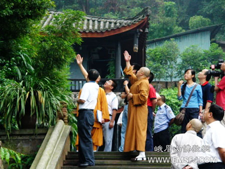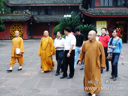 在果正法师、镇觉法师、昌明法师等人陪同下,夏代荣副市长从寺院山门开始,逐殿检查了寺院的消防安全设施、文物保护等,并询问了寺院日常的消防安全防范工作。检查结束后,夏代荣对峨眉山佛教协会和报国寺的消防安全工作给予了充分肯定。
