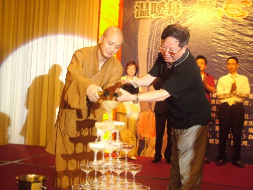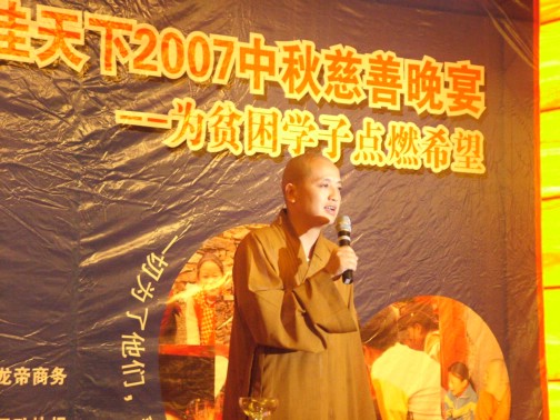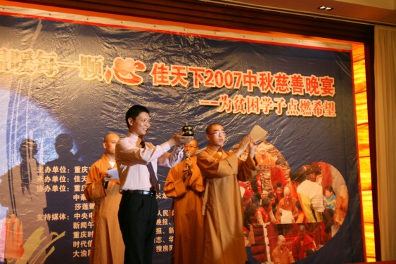 中国佛网消息华岩寺报道:9月23日晚7点,重庆戴斯大酒店内,来自重庆商界众多企业家及社会各界爱心人士,参加由华岩文教基金会举办“温暖每一颗心·佳天下2007中秋慈善晚宴——为贫困地区的学生托起明天的太阳”大型慈善活动。