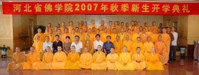 9月4日上午,“河北省佛学院2007年秋季新生开学典礼”在河北省佛学院礼堂隆重举行。典礼由河北省佛学院教务长明影法师主持。到场的领导和嘉宾分别是:河北省民族宗教事务厅张兴堂副厅长,河北省佛教协会高士涛副会长,河北省佛学院史幼鹏副院长,河北省民族宗教事务厅石彦林处长;河北省佛学院常务副院长、柏林禅寺住持明海法师,河北省佛学院讲师、柏林禅寺监院常照法师,河北省佛学院监学、柏林禅寺知客明清法师,河北省佛学院讲师月悟法师、明怀法师等。