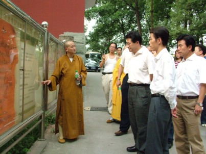 道坚法师(右三)正在陪同翁杰明部长(右四)参观将归还华岩寺作重庆佛学院女众部道场的原华岩小学