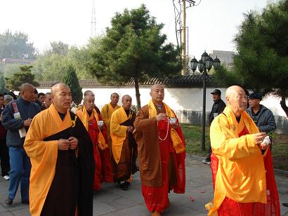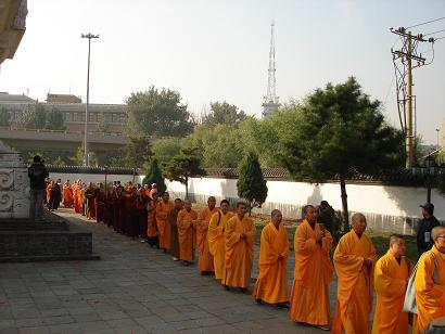 10月21日上午九点,沈阳市西塔护国延寿寺举行佛像开光暨沈阳市佛教协会乔迁庆典。由于近期正在召开十七大,法会一切从简,到会的信众大约有三千人左右,法会由营口楞严寺退居方丈圆山长老、沈阳市市佛教协会会长照元法师、市佛教协会副会长正伟法师主法。抚顺的盖诚法师、千山亲海法师及自辽宁省内各佛教协会团体及各大寺院的负责人大约有三百余僧众参加。