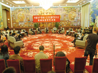 10月16日上午,中国共产党第十七次全国代表大会西藏代表团在人民大会堂西藏厅举行全体会议,继续讨论胡锦涛总书记代表十六届中央委员会向大会所作的报告。会议对中外媒体记者开放,西藏出席党的十七大代表就青藏铁路、环境保护、旅游业发展等记者们感兴趣的问题接受了采访。