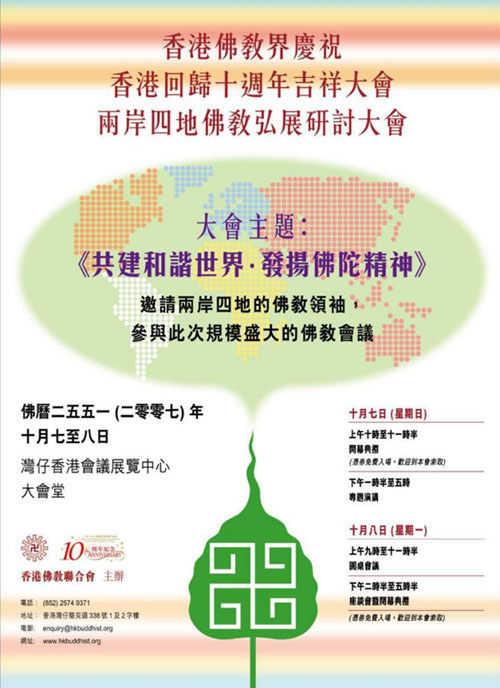 为庆祝香港回归祖国十周年,香港佛教联合会将于2007年10月7日至8日在香港会议展览中心举行“两岸四地佛教弘展研讨大会-《共建和谐世界 发扬佛陀精神》”。会议将广邀两岸四地高僧大德出席,为上述主题发表宝贵建议。