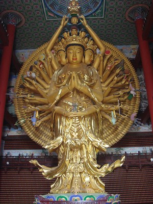 千手观音阁的南大门高20米,宽9米,是一扇壮观奇妙的铜门,左边门上刻有403尊铜佛,右边门上刻有546尊铜佛,这999尊铜佛像组成一个与门等高的大“佛”字,称为中国佛教第一铜千佛门。东林寺的千手观音为亚洲室内千手观音第一佛像,以桧木制作,40支手臂如一轮明月光环,与原佛像韵合一脉。佛像立于须弥台上,须弥台由66片花瓣围绕,构成高33米的巨大千手观音。
