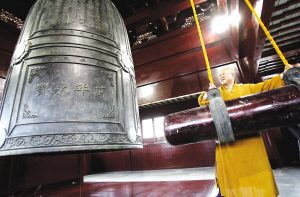 离开观音阁进入重元寺内,记者最感兴趣的就是钟楼和鼓楼了。重元寺所使用的铜鼓可是特别制造的铜腔皮鼓,也就是说这面鼓的鼓身是用铜打造的,而鼓面则用的是牛皮。而重元寺的钟更是大有来头,连名字都十分特别,叫唐代第一声第一律铜钟。原来这座钟发出的声音,就是唐朝所使用声律中的第一声第一律。为了让铜钟发出正宗的“盛唐之音”,铸钟之前,工匠们翻阅了历史典籍,造出了一根9寸9分长、9分9厘粗的律管来确定唐代第一声第一律究竟是什么样。记者敲响了这座重达13吨的铜钟,果然声音雄浑,余音绕耳。重元寺的大雄宝殿也十分气势不凡,面积在全国也是首屈一指。殿内还铸有国内最大的海岛观音壁,宽26米,高10.6米,总共雕塑了140多个人物。