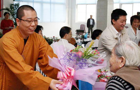 上海嘉定区佛教协会会长慧禅法师向老人献上鲜花
