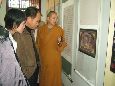 道坚法师陪同陈立平一行参观了华岩寺,最后,在华岩佛教艺术展览馆,陈立平先生挥毫泼墨,为华岩寺留下了两幅极具收藏价值的艺术精品。