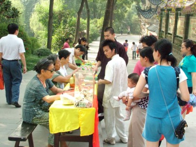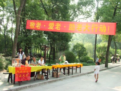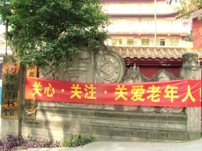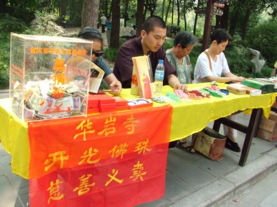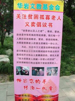 中国佛网消息 华岩寺报道:华岩文教基金会为倡议全社会都来敬老、爱老、助老,特于2007年十一黄金周期间,在华岩寺宏法楼前举行为期七天“我为贫困老人捐献一份爱心活动”,为帮助贫困老人开展开光物品义卖募捐。