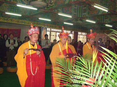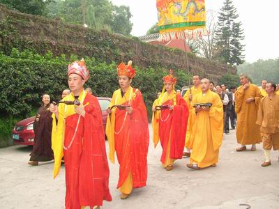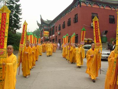 中国佛网讯 2007年10月27日下午,重庆华岩寺为期七天的水陆法会举行圆满送圣仪式,居士及信众近千人参加了此次法会仪式。 重庆华岩寺四众弟子在方丈道坚法师的带领下,仪式庄严而隆重。上千人的送圣队伍浩浩荡荡,声声“南无阿弥陀佛”的佛号中,在弘法楼前送圣:镇坛大将军手持“慈航普渡”和“镇守坛前”幡旗。一艘纸质西方大船,船边堆满了纸折莲花及金元宝。众僧列队一起唱诵,并把二十四席牌一一放到西方大船里。然后,三位法师率众僧及信众起腔念佛。在沉稳的佛号中,一位僧人鸣放鞭炮,点燃西方船,祈愿镇坛大将军可以护持西方船上的所有亡灵顺利往生西方。 下午3点,仪式在信徒虔诚发愿中圆满功德,标志着华岩寺一年一届的水陆法会,殊胜圆满。