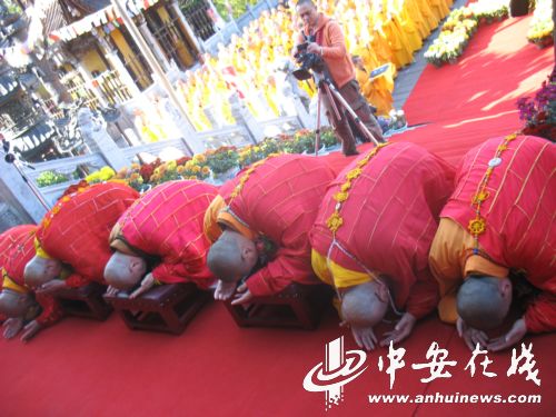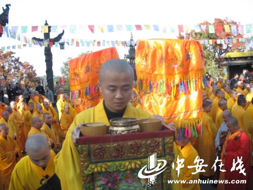 11月20日,中国佛教和韩国佛教界在安徽九华山隆重举办了“恭送金乔觉?地藏菩萨宝像赴韩国供奉暨祈愿中韩两国人民吉祥安乐大典”。
