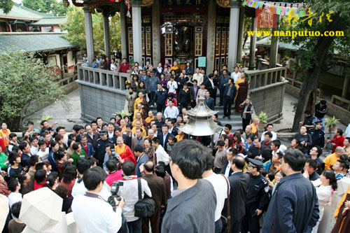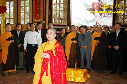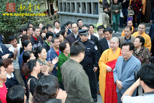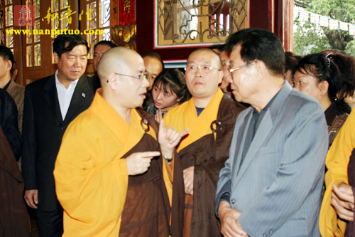 则悟大和尚陪同李瑞环夫妇一行参观了我寺的主体建筑,沿途围观群众热情鼓掌,问候李主席夫妇之声此起彼伏,气氛极其热烈。之后,在法堂,方丈则悟大和尚受圣辉大和尚委托率两序大众举行了庄严隆重的祈福法会,祈祷世界和平,国泰民安,社会和谐,祖国统一,并祝愿李主席夫妇身体健康,六时吉祥。